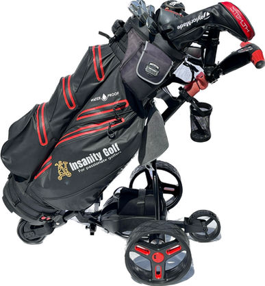Easily navigate the course hands free with your own personal E-Cart using the Insanity Golf Model LHW electric remote-control E-caddy for energy-conscious golfers. This E-Cart is powered by two high-torque tubular motors 2x200w with slope control technology nicely hidden within a sealed enclosure in the frame. Speed can be controlled by adjusting the speed dial on the handle to match the walking speed of the golfer or send the cart ahead to the next hole with the remote control, which has variable speed and forward-backward, left-right directional control. The portable rechargeable lithium Ion battery will power the cart up to 36 holes on a full charge. Constructed of a durable, high quality, light weight aluminum frame, the E-Cart conveniently folds down for easier transport and storage.